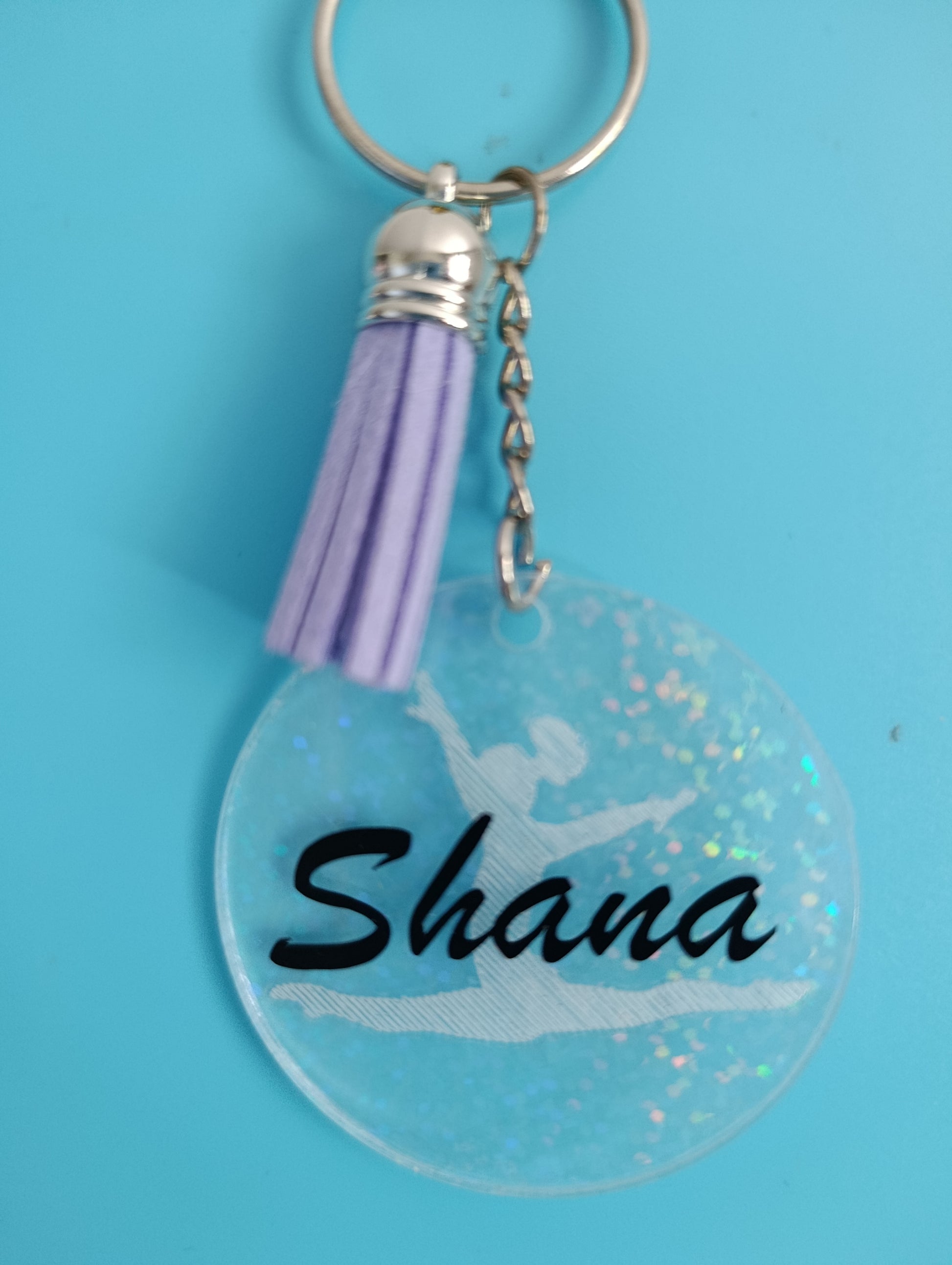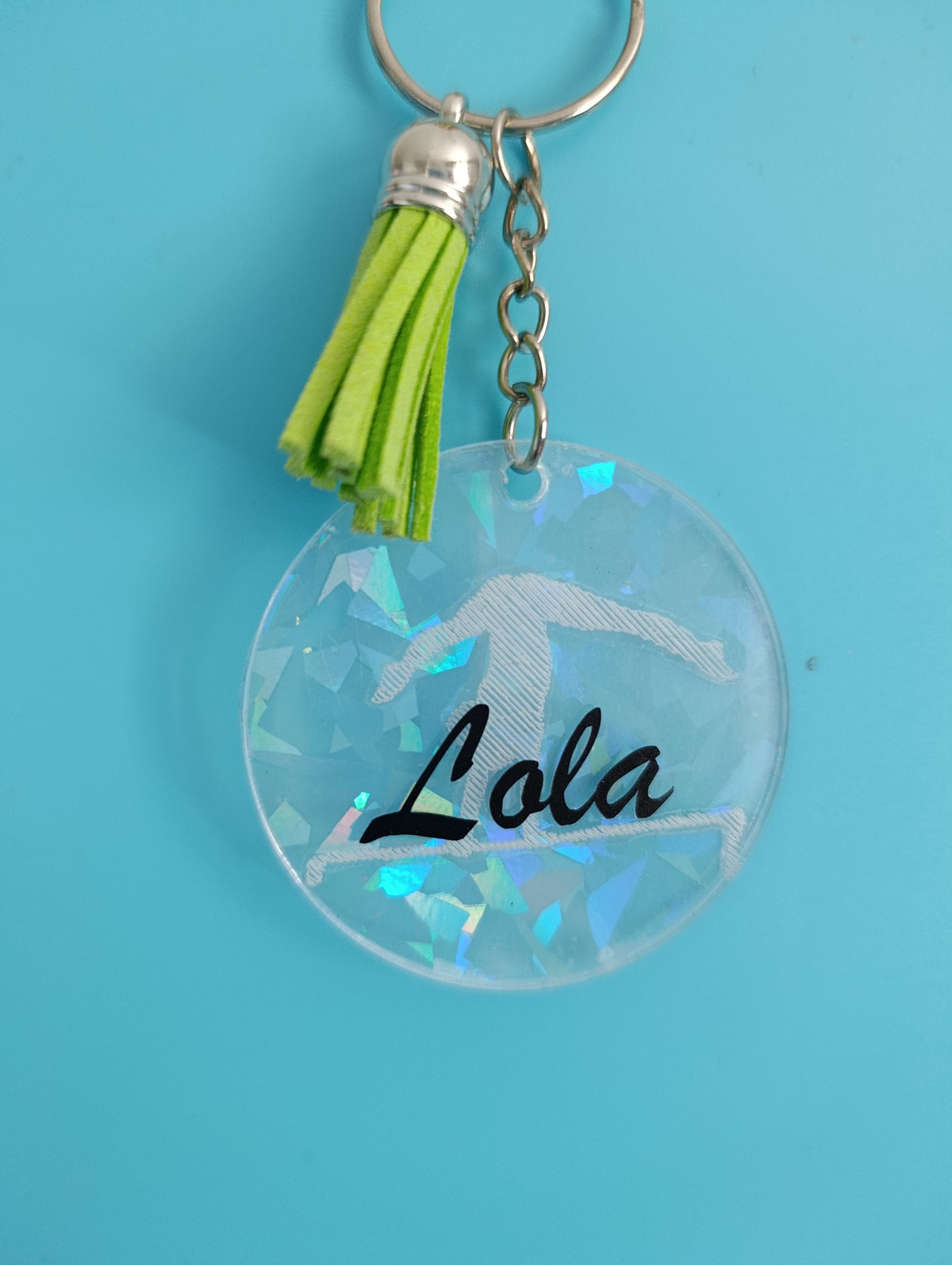 Disque acrylique transparent de 5cm de diamètre avec le choix de la gravure parmi les 10 modèles proposés . Prénom écrit en noir. Anneau doré ou argenté en fonction du stock. Fond du porte-clés avec effet holographique et couleur du pompon aléatoire.